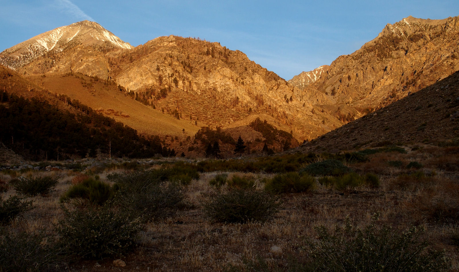 SUNRISE VIEW OF BAXTER PASS REGION FROM TRAILHEAD THE NEXT MORNING.